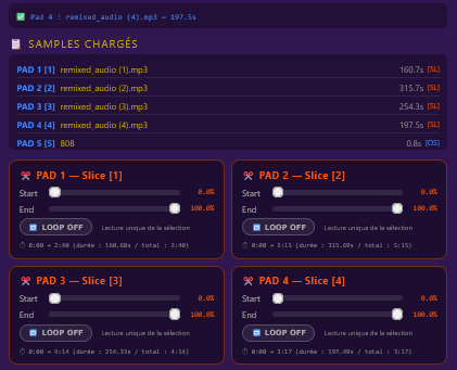 Découpez vos samples avec des points Start/End/Loop par pad. Mode One-Shot ou Slice, vélocité dynamique.