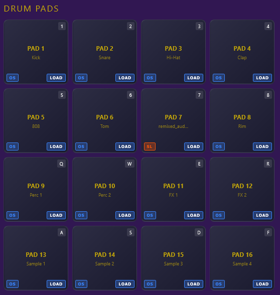 L'export WAV, la sauvegarde de sessions et le chargement de samples personnalisés sont désactivés. Les 16 pads, le séquenceur, les effets et le MIDI restent accessibles. Vous pouvez acheter la licence à tout moment pour débloquer toutes les fonctionnalités.