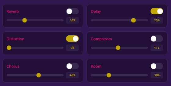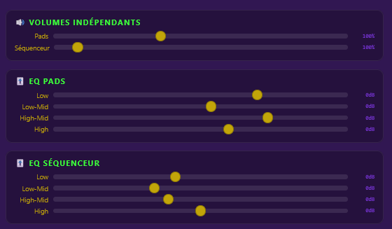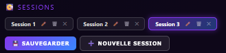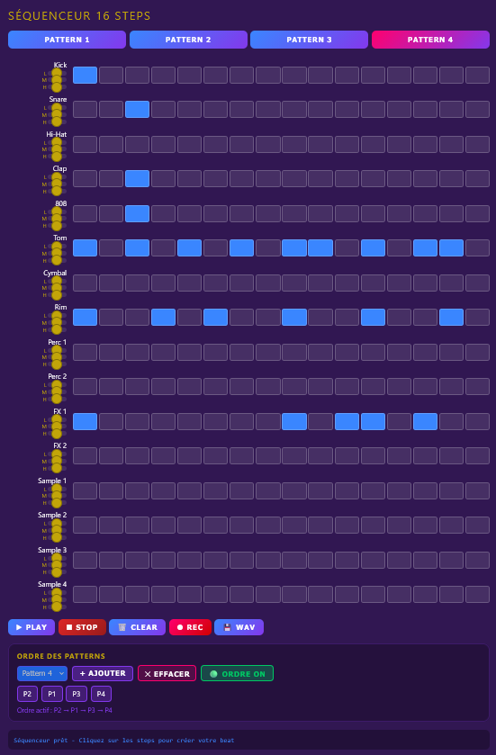 Créez autant de sessions que vous voulez. Chaque session sauvegarde vos patterns, samples, réglages EQ et effets. Renommage par double-clic.